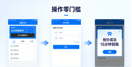 其次是小程序操作 “零門檻” ,不用下載 APP,不用復雜注冊。打開微信,直接搜索 “京質回收” 小程序就能進入,首頁分類導航清晰明了:電商卡券、商超卡券、影音會員、出行服務、餐飲禮品卡等板塊一目了然,就算是不擅長用手機的長輩,也能跟著指引找到對應卡種。以回收沃爾瑪購物卡為例,全程就 3 步:選擇 “商超卡券”→“沃爾瑪購物卡”→填寫卡號卡密→提交申請,不到 2 分鐘就出核價結果,確認后 15 分鐘內(nèi)就完成核銷到賬,比轉賣節(jié)省了至少半天時間。