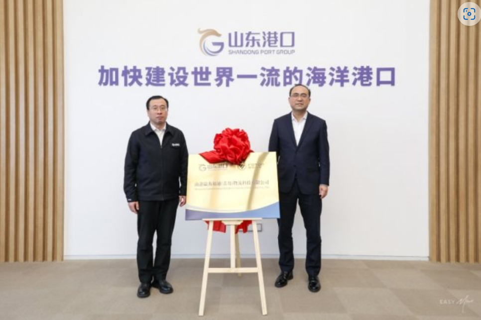 簽約儀式前,雙方參觀了山東港口展館、青島港自動化碼頭,并進(jìn)行座談交流。在常瑞、李兵、高立平、高亞的共同見證下,武錫斌與王瑋作為雙方授權(quán)代表,正式簽署戰(zhàn)略合作協(xié)議。緊接著,在熱烈的掌聲中,常瑞與高立平攜手為雙方共同出資成立的合資公司“山港陸海福通(青島)物流科技有限公司”揭牌,象征著這一戰(zhàn)略聯(lián)盟的實體化運營正式啟動。